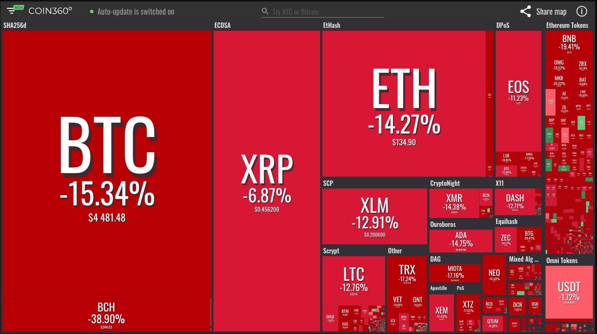 За прошедшие сутки крипторынок серьезно пострадал. BTC впервые за долгое время опустился ниже $5000, в то время как почти все топовые коины потеряли больше 10%.